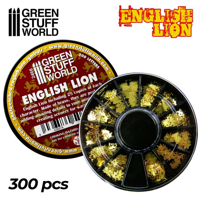 Collection of 300 English Lion symbols and signs made of brass. There are 12 different types to choose from, separated in different compartments. They are perfect for adding details to armour, weapons and banners of your models and miniatures or for decorating dioramas. We recommend using cyanocrylate glue in small quantities. Approximate thickness of characters: 0.26mm Size: 1-5mm Quantity: 300 characters (25 units of each character) NOTICE: Due to the small thickness and size of the pieces, some could come out of the separator disk, or change compartment.