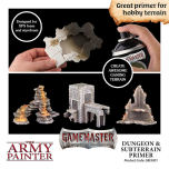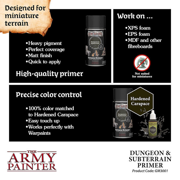 Gamemaster Terrain Primer Dungeon & Subterrain provides a quick and perfect coverage with a highly pigmented coat. This primer is easy to touch up because it has a 100% matching colour from our Warpaints range. Great for all kinds of dungeon and subterrain landscapes. CONTENTS • 300 ml waterbased terrain primer 100% WARPAINT COLOUR MATCH • WP1430 Hardened Carapace