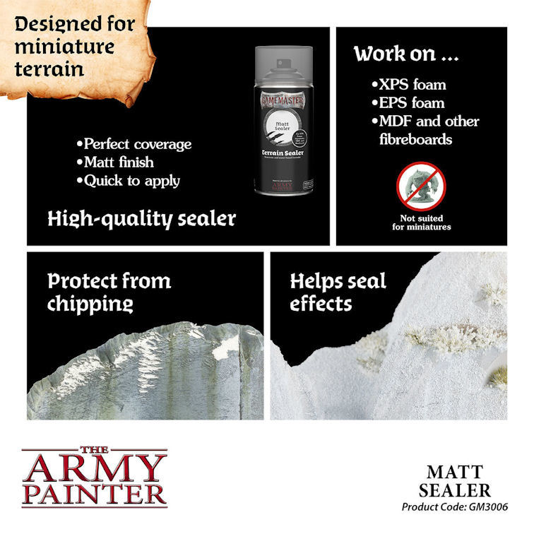 Gamemaster Matt Sealer is a high-quality varnish which gives a protective layer to your RPG or wargaming terrain. Preserving the details and adding durability in a flat matte finish. Great for protecting all kinds of hobby terrain. CONTENTS • 300 ml waterbased matt terrain sealer